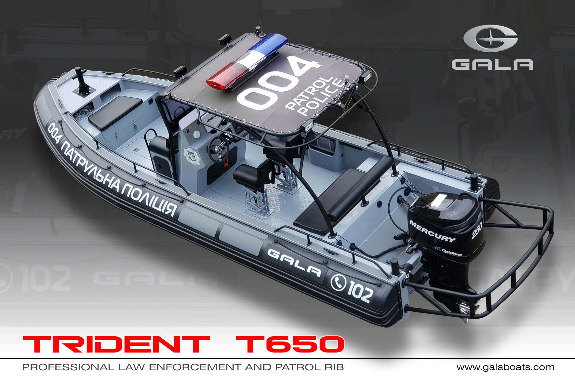 A TRIDENT T650 az első hajó a GALA-tól, amelyet profi célokra fejlesztettek ki. Ez a hajó megfelel a legszigorúbb követelményeknek a rendészeti, a nagy teherbírású katonai és kereskedelmi felhasználás tekintetében. Szuper erős alumínium hegesztett héjazattal rendelkezik, D-TUBE-vel és a hajótest beépített flotációjával. Számos lehetőség van a hajó kialakítására, legyen szó rendvédelmi, katonai, vagy mentőhajóról. További információkért vegye fel a kapcsolatot értékesítő kollégánkal. Katona Csaba 0620/500-98-99